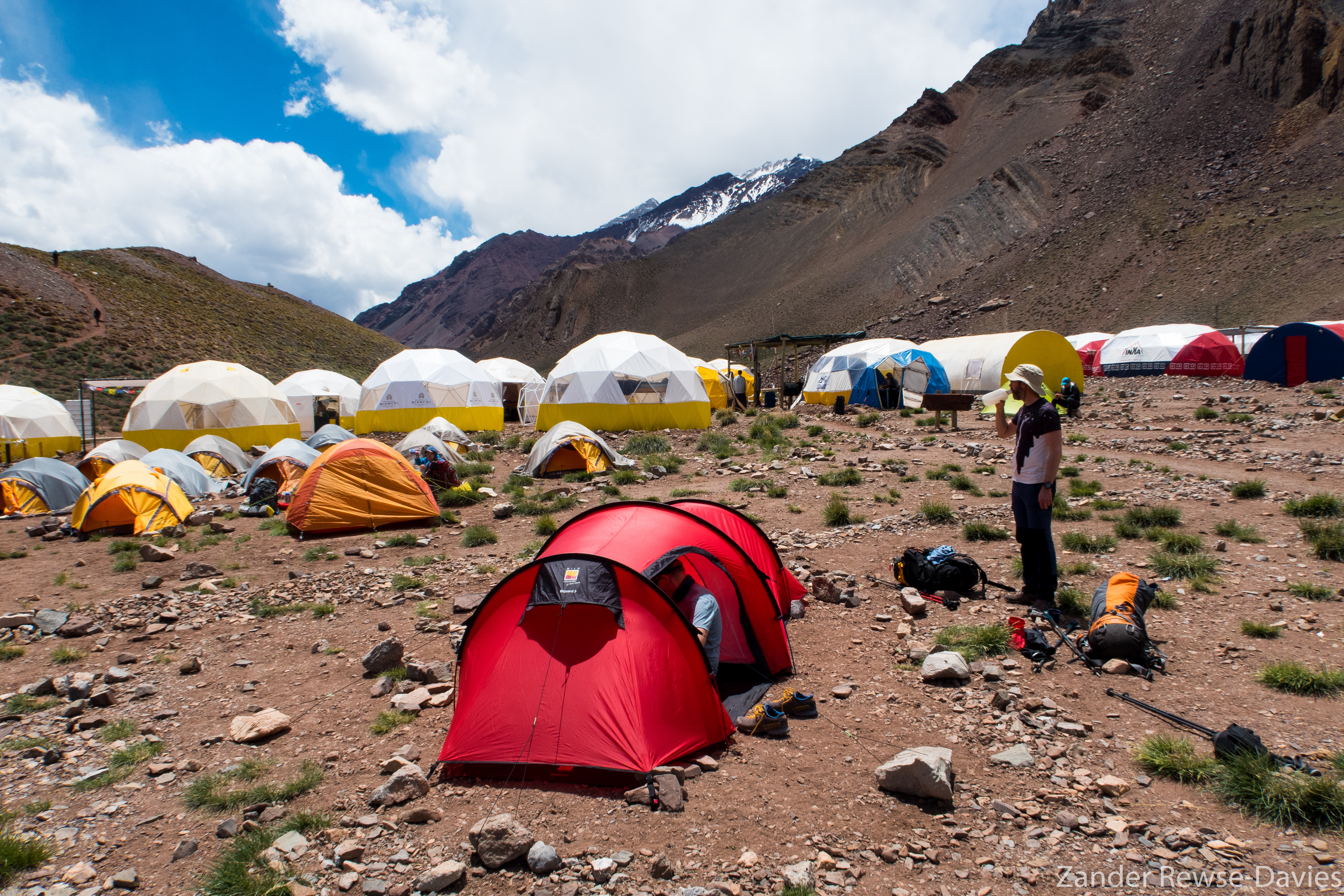 We took our first steps into the park at a relaxed pace and wandered in awe through the spectacular route on our way to the Confluenza approach camp. It was here that we gained our first view of the mighty Aconcagua’s south face; an imposing beast, slumbering at the end of a long meandering valley which guided us to our prize. The valley floor was lined with a rich carpet of green over brown, while the steep sides were composed of beautiful, banded sandstones in every conceivable colour. Even with the mild elevation gain from 2800m to 3400m, I could feel a shortness of breath, in amongst the stomach cramps lingering from the previous day. Nevertheless, we made it to the camp in excellent time and got our first peek at one of the canvas metropolises that dominate high-altitude mountaineering life.
