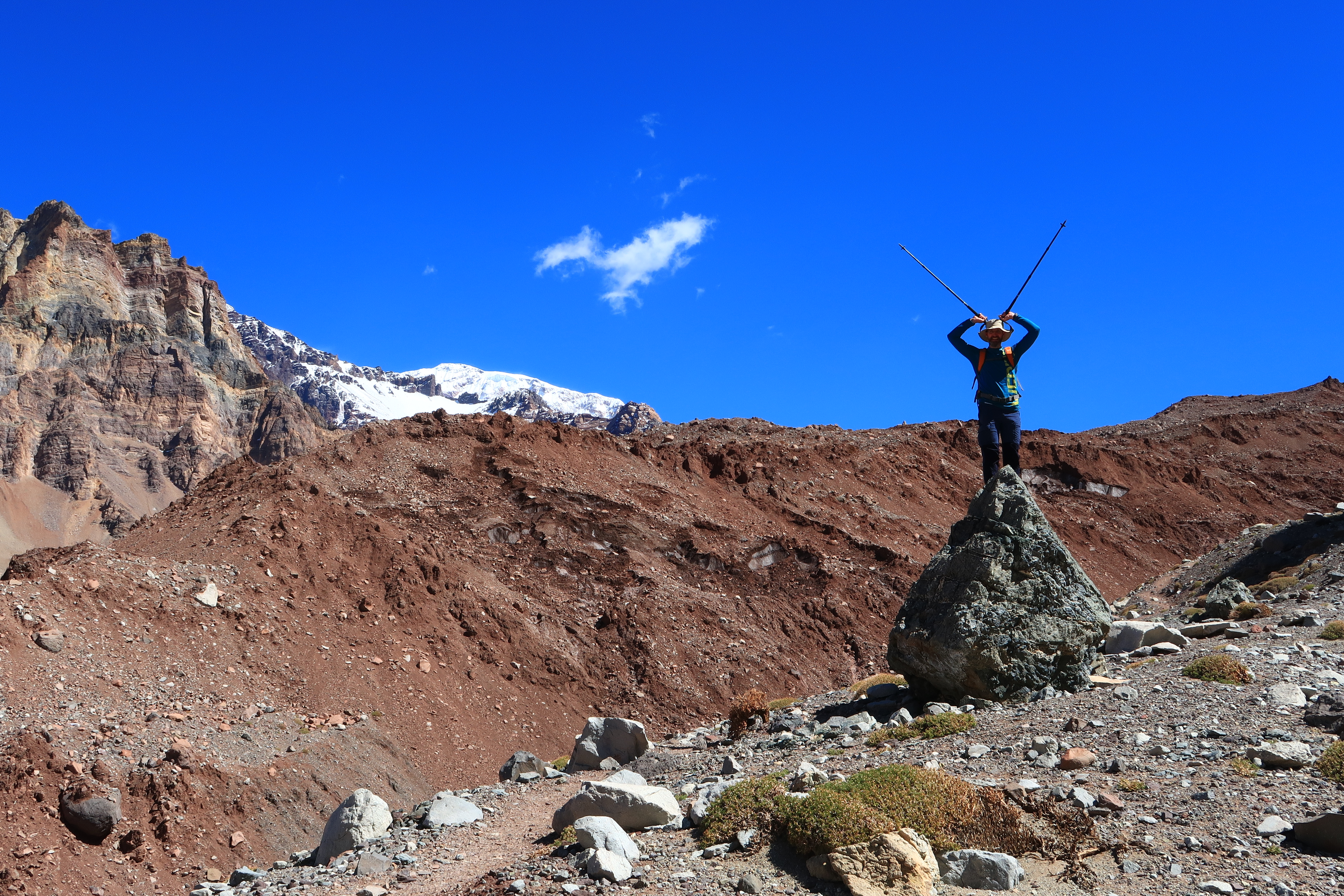 Humbled and mildly nervous of what we’d have to scale in the coming weeks, we trudged back to find Guy, who’s seemingly lifeless body we found curled up in a cosy enclave. The walk back for me was significantly less fun than the walk in; my knees were reminding me that they did not care for carrying their heavy load downhill and, as such, I fell behind the others. While I was optimistic on my chances of making up the mountain, I began to wonder whether I might ever be able to get down again or I’d have to apply for high altitude residency. Furthermore, the thin air was playing all kinds of havoc on my body and I panted my way back to camp. A stop at the doctor’s tent for the mandatory blood oxygen check revealed that mine was lingering at a measly 73%; enough to warrant a trip to A&E at sea-level. Guy was a whole 6% above me and Ian appeared to have developed Nepali genes. Despite the thin air, I was only at 3200m here; much less than half of what I’d have to climb. If my acclimatisation carried on at this rate, I’d have no hope of reaching the summit of the highest mountain in the Western and Southern hemispheres. To add to my woes, I barely slept a wink all night, plagued by headaches before one of our biggest days on the mountain; the long haul to the Plaza de Mulas base camp at the foot of the mountain.