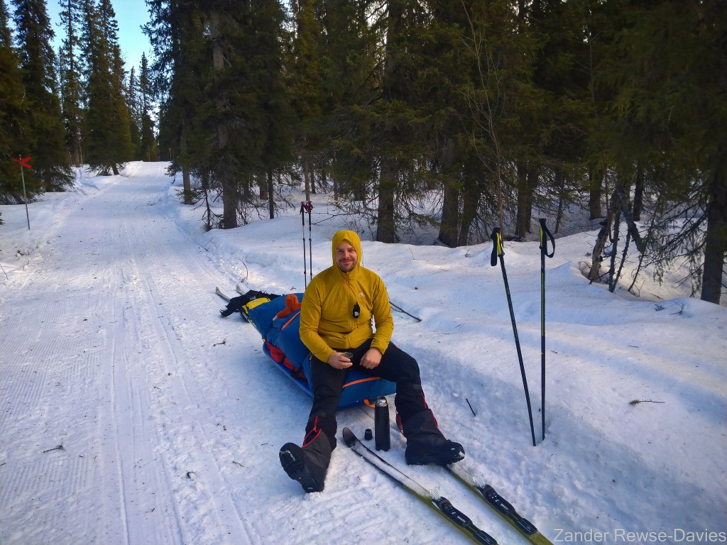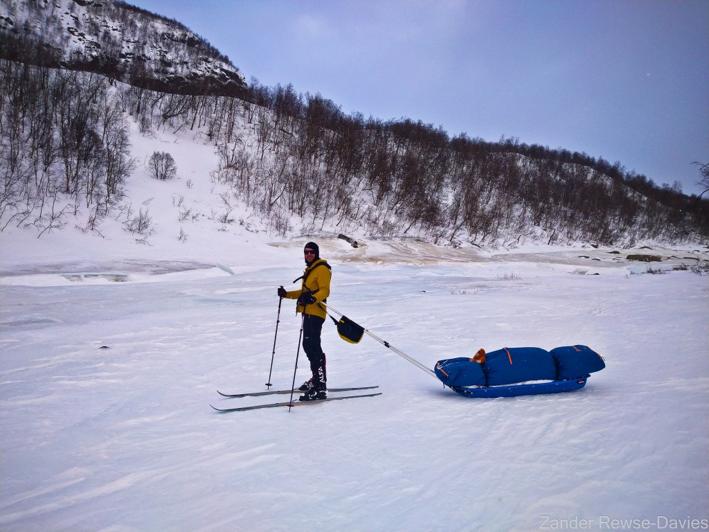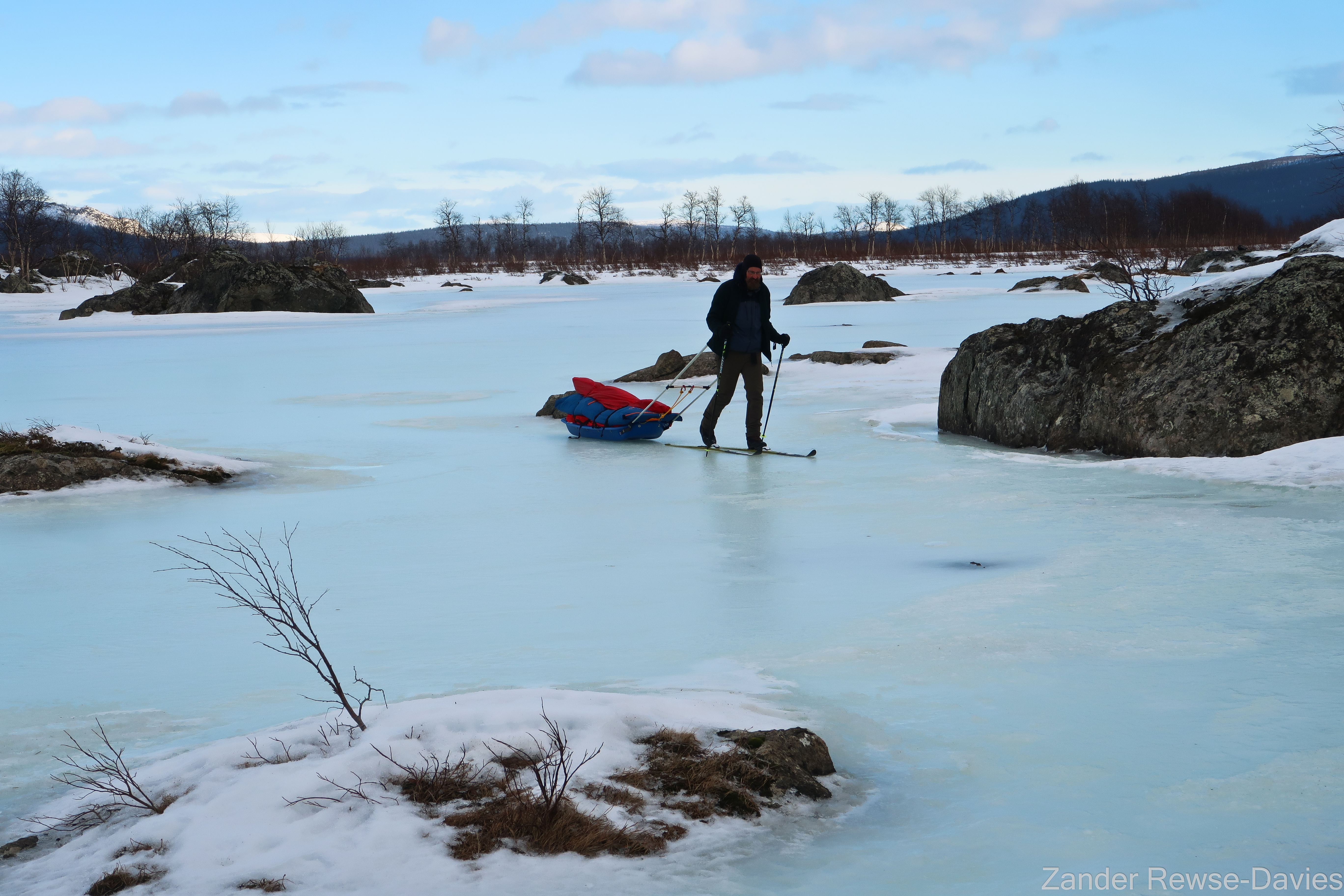 After a questionable night’s sleep and a hearty breakfast of porridge, courtesy of Expedition Foods (channelling his inner Brit, Ian had opted for a curry breakfast), we set off across the next lake. Wind scoured, our path was lined with sheet ice for the majority of the exposed sections. While this allowed for good progress, it proved to be mentally draining as our skis struggled for purchase on the slippery ground, yet we made good time. Our pace only slowed through the trees where storm debris had littered the route with fallen branches and wayward pinecones which played havoc with my delicate mohair skins, shredding them mercilessly and further robbing me of needed grip. Shortly after midday we happened upon a pair of typically outgoing Swedes, pausing only to mutter a short comment on Hector the cuddly orangutan who was riding atop of my pulk. Having only done a short tour, they could provide no helpful insights as to the conditions on the Rapadalen river further ahead. Helpfully, Ian had impressed them with his ground-seeking skills as he tumbled just in front of them.
