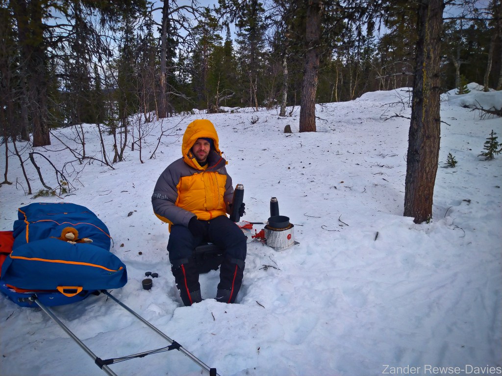 Under the shadow of the guardian of the Rapadalen, we found a suitable hill lee in which to pitch our tent out of the wind, and trees upon which to secure our insurance. We dug the obligatory snow holes in the porches to allow for relative comfort in sitting and proceeded with the ever tedious task of boiling many litres of water from debris laden snow. Such was the weather that I had even found water sloshing about in the base of my pulk from the spoils of windblown snow. Having reached further in three days than I had previously in five, we treated ourselves to a well-earned dessert of chocolate pudding after our freeze dried curries. I don’t know whether it was just the setting, but it certainly ranks as one of the best chocolate puddings that I’ve ever had. Hats off to Expedition Foods for that treat. After a minor adventure up the local hill, struggling in waist deep snow to spy the route ahead, I returned and settled down for the night brimming with optimism for our progress thus so far achieved.