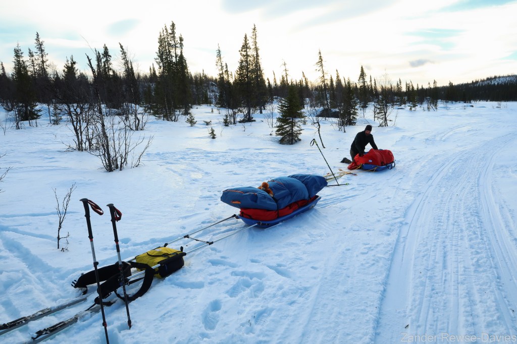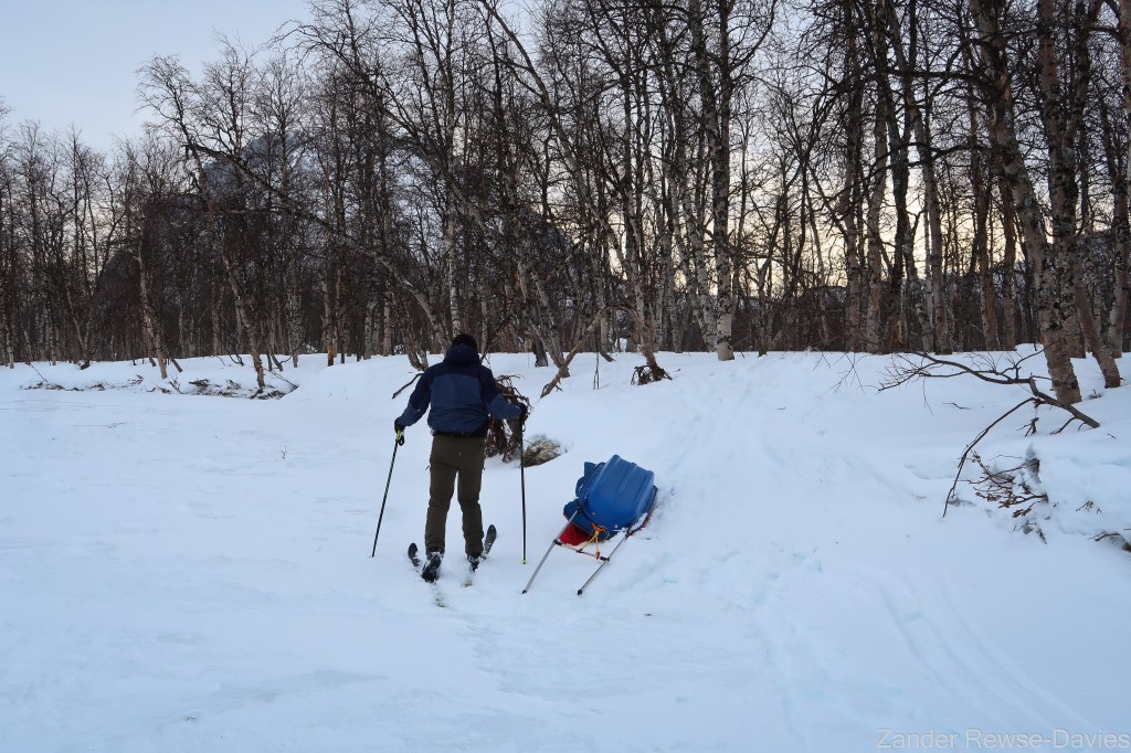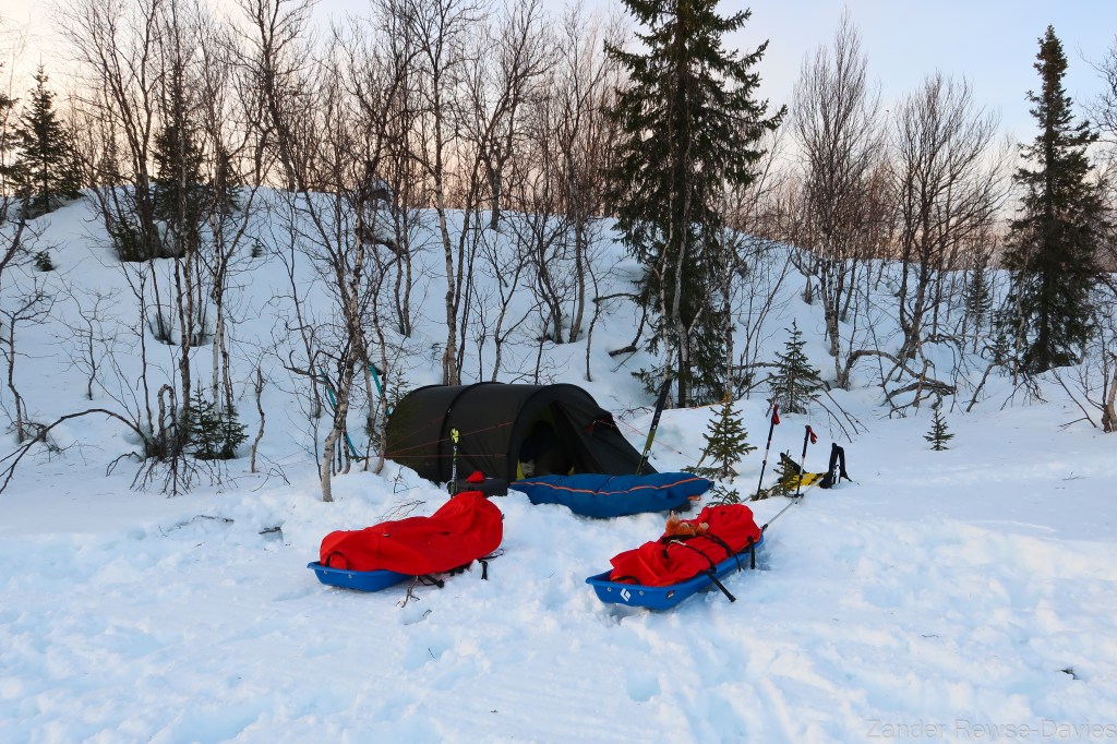 Not content with letting Ian steal the limelight, I later had to make a shameful retreat to chase an errant ski which had made a bid for freedom down the hill during a steep climb which required us to resort to hauling up in just our boots. Having covered a modest fourteen and a half kilometres and wanting to save our valiant feet, we stopped for the night in a small forest which provided ample pine fodder for securing the tent to. While we waited for the snow to harden, again, I surveyed the damage to my skins caused by the stricken branches ripped from nearby trees which lined our path. Within just two short days I was having to replace my skins; a worrisome turn given that I only had one good nylon pair remaining, albeit a sturdier material but at the cost of glide. Faced with a steep hill the following day, I was sure that my tattered mohair pair would not do what was to be asked of it. Having not received my additional set in time due to the fiasco that is the Brexit customs system, I would have to resort to the grippy set that Ian had hastily obtained for me upon his arrival in Kiruna before our drive to Kvikkjokk.