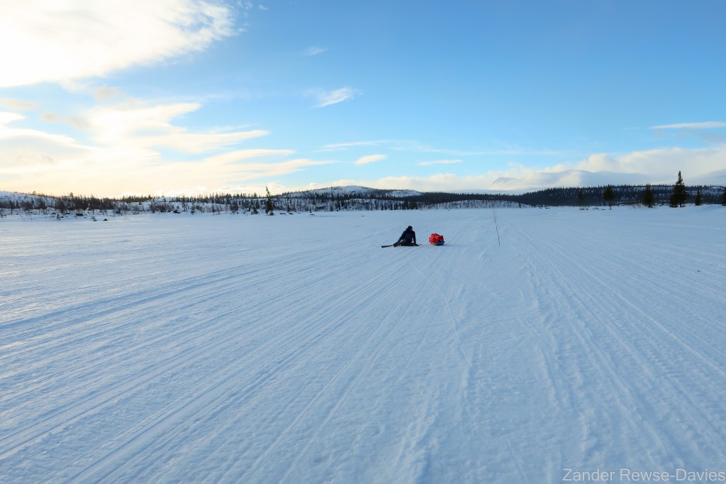 Karma would soon return the favour though. At the other side of the lake we climbed up another familiar hill to its crest where, two years previous, I had camped out on my return leg and briefly regretted my decision to turn back following a surprisingly smooth night where everything fell into place, despite my wrecked feet. When I had descended this hill back in 2021, I was sporting a pair of Alpine skis and boots which made the whole experience rather manageable. However, on this occasion, the icy slopes, tight turns and undulations made the entire descent mildly terrifying with very little semblance of control throughout. How I managed to get to the bottom with an unwieldy pulk attacking me from behind, while avoiding a tumble, is a mystery, but it certainly got my pulse racing. Ian, on the other hand, fell victim to Karma’s cruel humour. Having switched from the troublesome rope hauling method to the more conventional Scandi-bars, his pulk had taken exception to the missed opportunities to ram him from behind. Instead, it chose to give him a timely shove, resulting in his rather spectacular face plant at the bottom of a mad toboggan run.