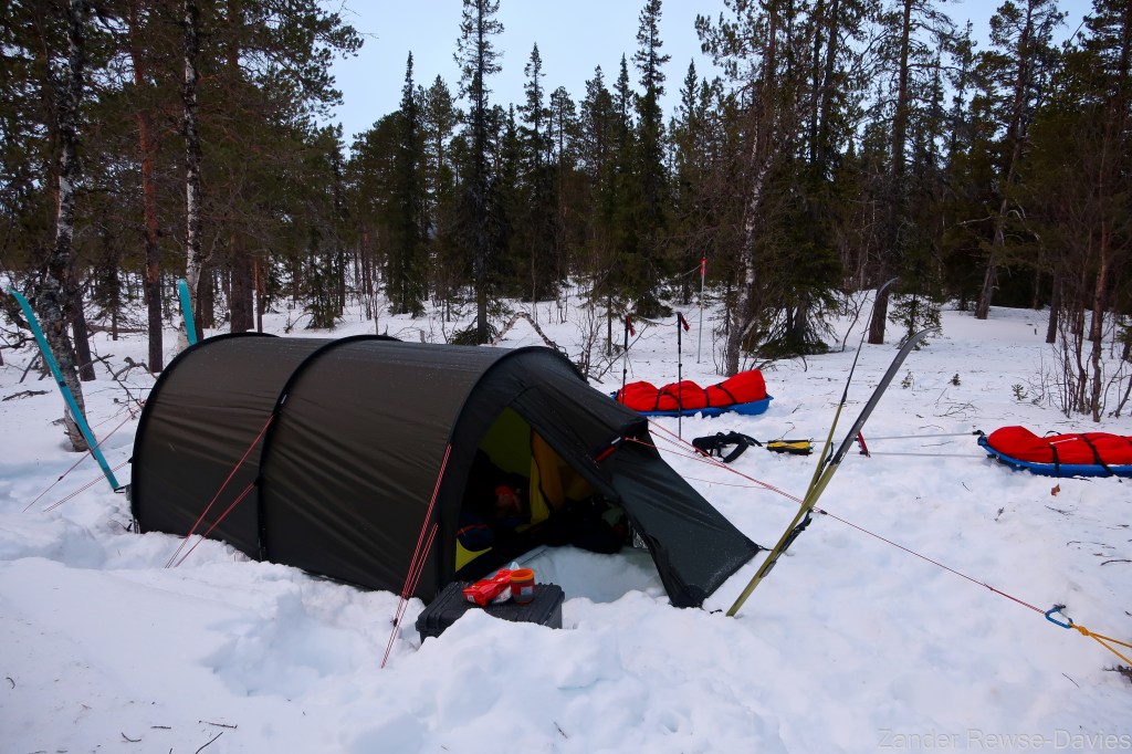 It should be no surprise that we covered that ground with little effort, other than to try and remain upright, and after twelve kilometres we decided to call it a day so as to not overstress our feet on the first day. To avoid potentially crippling blisters, I find its usually best to ramp up the efforts rather than become overzealous with one’s as of yet dilapidated stamina. With the strong winds having scoured any penetrable snow from the lake, we sort the deep snow of the woods to provide sufficient purchase for our tent pegs. For those who recall my previous adventure in these lands, you’ll be aware that setting up camp in wind-blown snow can be a trifling affair; the snow doesn’t compact readily and one must exercise significant patience for it to harden after preparation. A similar fate would await us throughout the next couple of weeks so, having observed how uncooperative it would be, we tramped down the snow and waited for it to harden. During this pause we had started to become aware that our ‘sheltered little spot’ might not have been so sheltered after all, but simply the victim of an untimely lull in the wind.