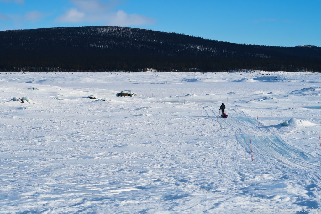 Having tackled the climb with relative ease, and with daylight to spare, we sailed past the planned campsite with a ferocious wind broadside. Despite struggling to remain largely upright against the onslaught, we decided to press on and turned east to make the long crossing of the next spur of the frozen lake on which we travelled. As any cyclist will attest to, crosswinds are not a jot of fun and headwinds are quite beyond the pale. However, tailwinds are a thing of joy and, on this occasion, provided as much delight as to have me almost toppling over with laughter. With simply upright stance and outstretched arms, my body provided sufficient sail as to propel me along at almost 20 kilometres per hour. With my pulk behaving much like an unwieldy stallion that insists on being ahead of the herd, the top bag had helpfully caught the wind and flipped upwards, creating its own sail. The result was that I largely found myself being overtaken by the pulk in storm force winds and both of us, being connected by rigid bars, propelled along sideways with little control over direction and speed. The only dampener to this windward joy was the occasional sighting of open water on what should have been a thickly frozen rink.