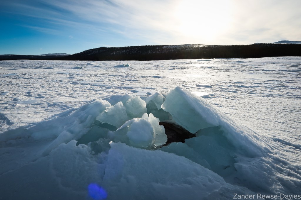 The following day began with much anticipation, for me at least given my history here, and we set off in good sunlight on heavily rutted ice. The skiing wasn’t pleasant but the greater purpose drove us on. It wasn’t long before we crossed the great Tjaktjajávrre lake which had produced so many spectacular ice sculptures on my previous adventure. This occasion was no different and the lake art did not disappoint; thrusting rocks through meter thick ice and giant ridges and cracks perpetrating the landscape. The cause of this icy anarchy was a hydroelectric dam dozens of kilometres further down which resulted in the level of the lake dropping and causing the spectacular upthrusts which littered our passage. One such giant ridge left a sizeable icy descent, complete with drop-off, that I had failed to judge properly and thus had a rapid and stern discussion with the ice at the bottom which shredded my right hand and glove. Ian, ever helpful, had waited at the bottom to film the event while failing to point out the better line which avoided the drop.