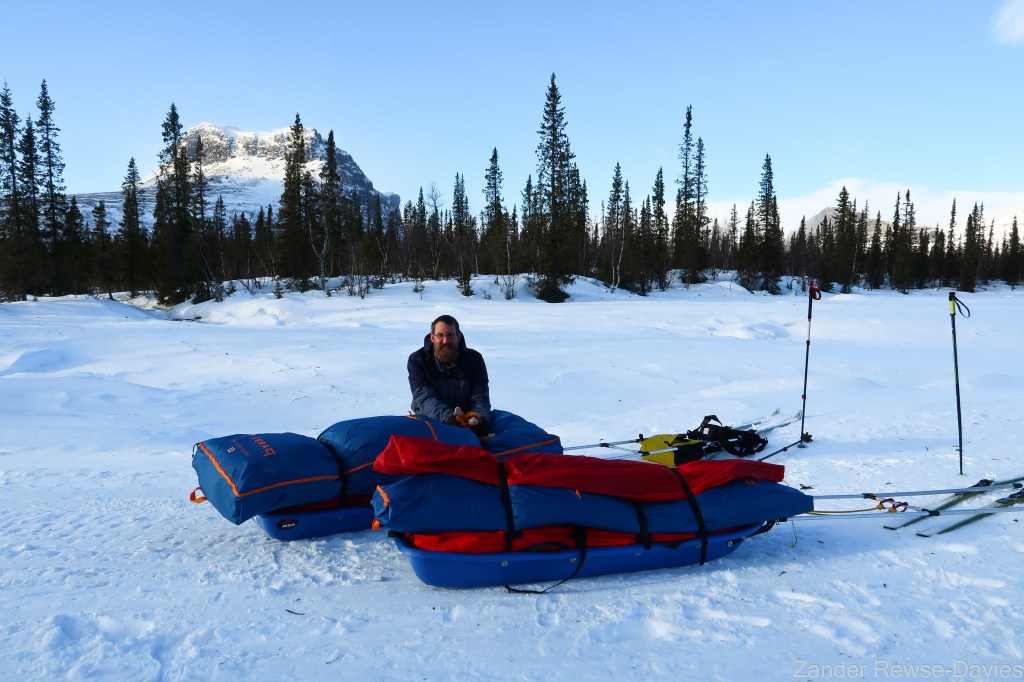 Having swapped my lethargic powder skis and Alpine touring boots for a dedicated set of Nordic ‘Fjell’ skis and ultra-warm expedition boots , progress was surprisingly swift as we climbed the 400m to the first frozen lake. To provide a little entertainment, Ian delighted us with a few timely tumbles on the short downhill sections as his pulk (sled) shunted him from behind in a bid to be the first down the hill in a chaotic mess. Having chosen to haul his pulk with a rope, rather than the traditional set of rigid bars favoured by the Scandinavians, the pulk would attempt to overtake him at every given opportunity. To be fair, with Scotland lacking in any snow in which to practise this year, it was his very first time venturing out on Nordic skis. While incredibly efficient for long days hauling a pulk, and comfortable enough to spend weeks strapped into without respite, they require the balance and finesse normally reserved for a ballerina.