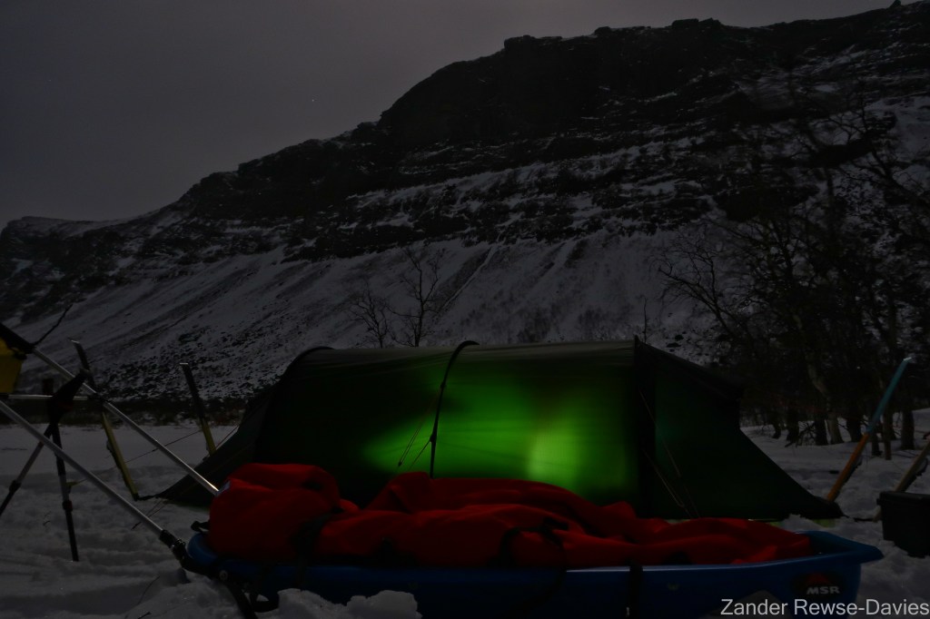 Having made camp with some relief, we settled down to a delicious hot dinner and a swig of single malt while Armageddon raged around us. I dare say that spirits were high following our small but not inconsequential victorious battle of the previous hours. Luckily our tree lined knoll offered significant shelter against the ravages of mother nature, but nevertheless, it was not a particularly peaceful night. Aside from the tent walls billowing noisily, I was also kept awake with unwelcome anticipation with every particularly strong gust. Yet, despite the fury swirling around our tent, and dangerously high temperatures having befallen us, it was great to be back in Sarek! We were even briefly treated to a miniature Aurora Borealis. While this was barely a sneak peek compared to the spectacle that I had been lucky enough to witness two years previously, it was no doubt a good omen.