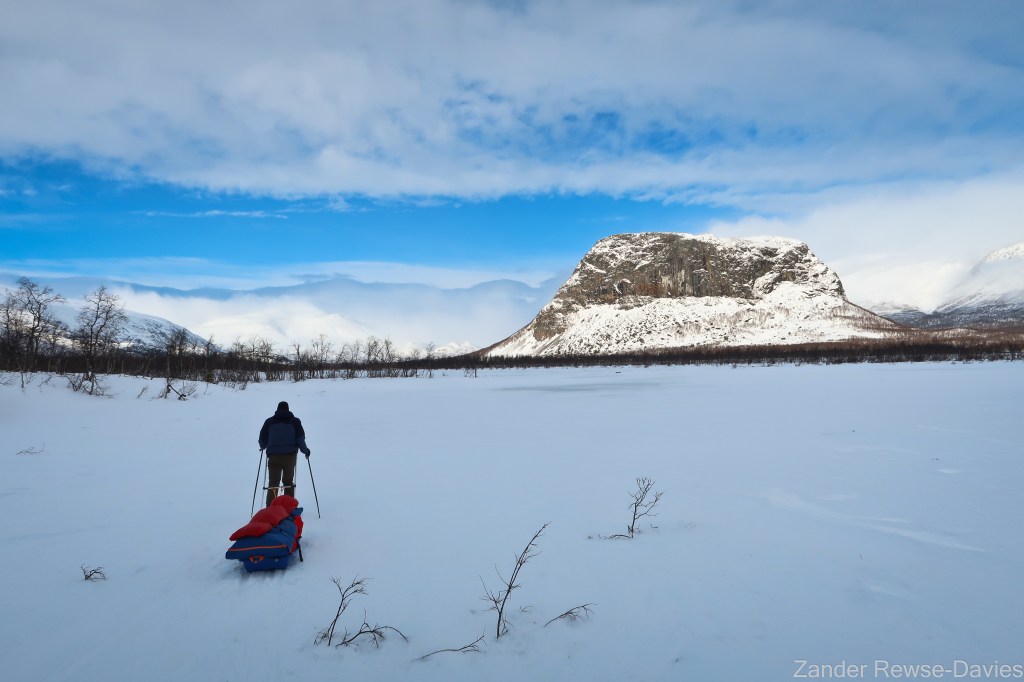It was at the bottom of this hill, however, that was the gateway to that beautiful valley which has frequented my thoughts on many an occasion for the last couple of years. It was here that we would leave the diabolically chewed up park ranger’s snowmobile track for the great Rapadalen valley. Sympathetic to our cause, the clouds had once again parted to reveal the guardian of the Rapa; the mighty Nammatj. From here our progress slowed considerably as, despite having the luxury of a relatively fresh pulk track ahead of us, the semi-frozen crusty snow sapped every ounce of our energy. To compound my suffering, the balls of my feet had started to complain, much as they did two years previously. Resolute that I would not be scuppered by such trifling matters as foot pain, I put it to the back of my mind and pushed through.
