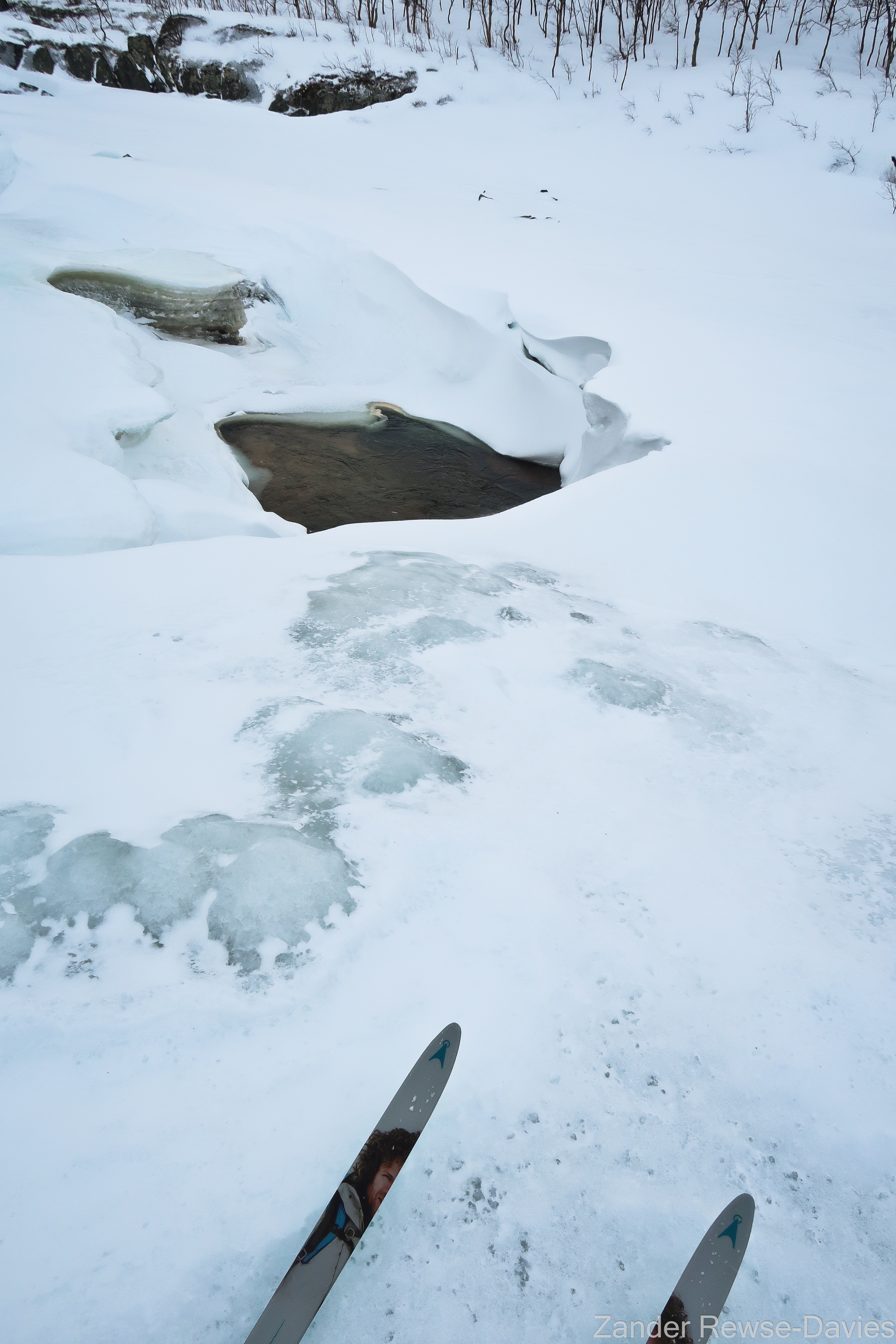 Buoyed by our rediscovery of easier passage and fuelled by a welcome refreshment of tea & cake, we followed the trail past further open water channels until it brought us back out onto the ice of a side stream which ran parallel to the winding Rapadalen. The ice here was largely in good fettle and skiing was mostly concern-free, aside from the usual risk of falling flat one’s face. Following the track led us to a crossing that weaved through small patches of open water; clearly it has supported those before us, but one can’t assume that good ice for a light chap on one day is still supportive for a larger gent the next. After a brief yet sober discussion, we opted to proceed and Ian led the way across this decidedly dodgy ice channel. Aside from one of Ian’s poles breaking through the ice next to his skis, we made it across without incident, much to our relief. After again losing the path, we snaked our way along a mix of wooded hills, snowy banks and icy stretches of river, all the while facing an increasingly tedious headwind.